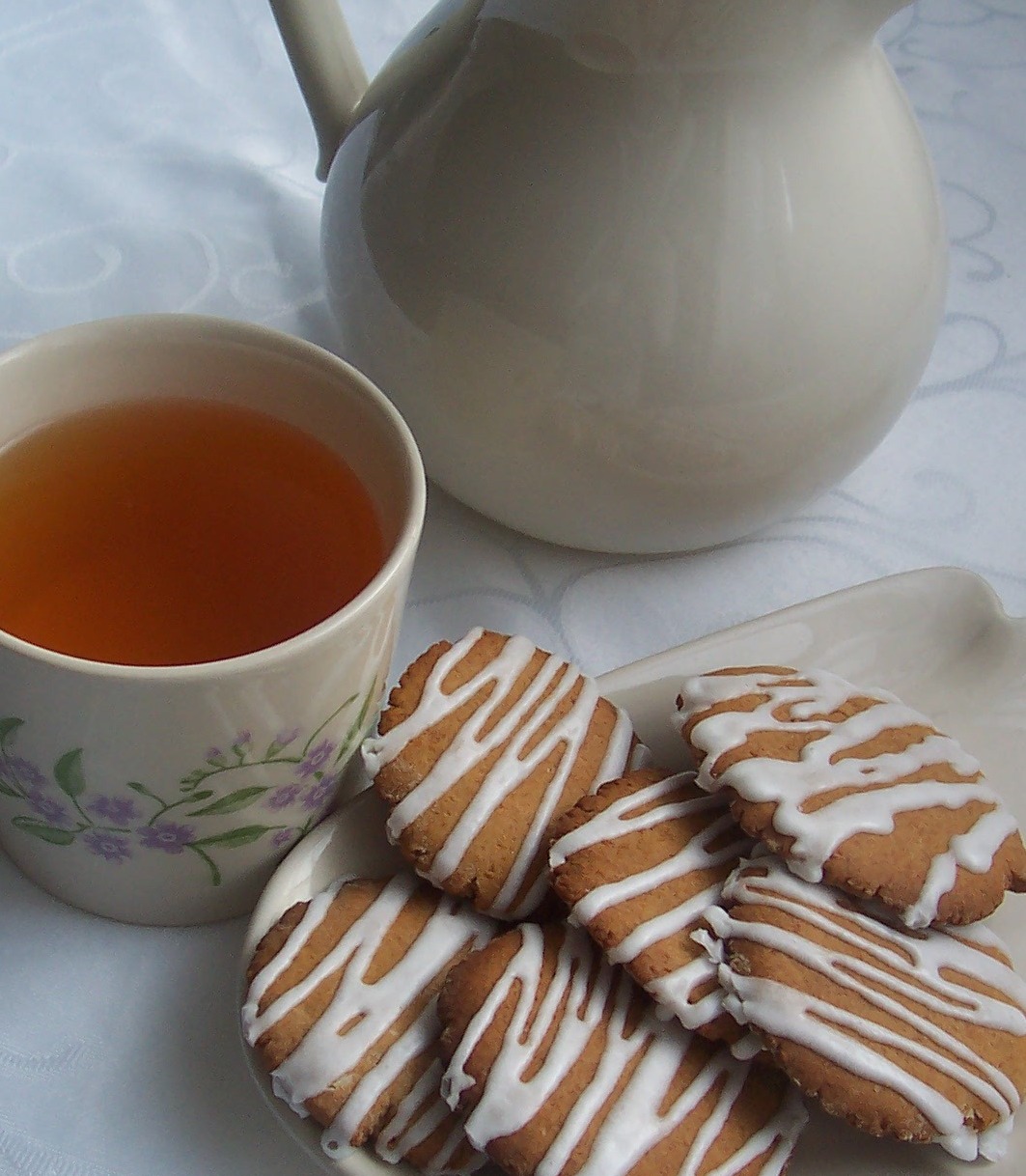 Közben elkészítem a citromos mázat, a tojásfehérjét a citromlével összekeverem, majd apránként hozzáadom a porcukrot. Homogénre keverem, kézi habverővel addig habosítom, amíg a kanál hátuljára vékonyan rátapad. A mázat nyomózsákba töltöm és kisült süteményeket csíkozással díszítem vele.