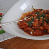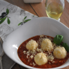 A mártáshoz a szétnyomott fokhagymát olajon megfuttatom, hozzáadom a pestot, majd a vajat, beleforgatom a kifőtt gombócokat, majd a végén rászórom a reszelt sajtot, és az egészet még egyszer átforgatom.