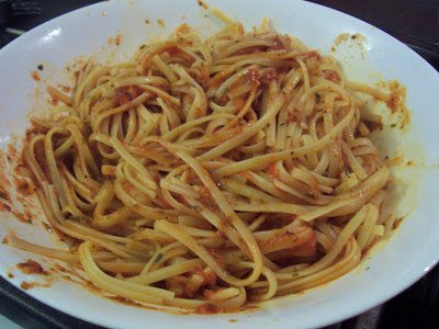 Közben a tésztát a szokásos módon kifőzöm, beleforgatom a szószba, és rögtön tálalom a sajttal (ezen a képen még nincs sajt, a kép a sajt szórása előtt készült)