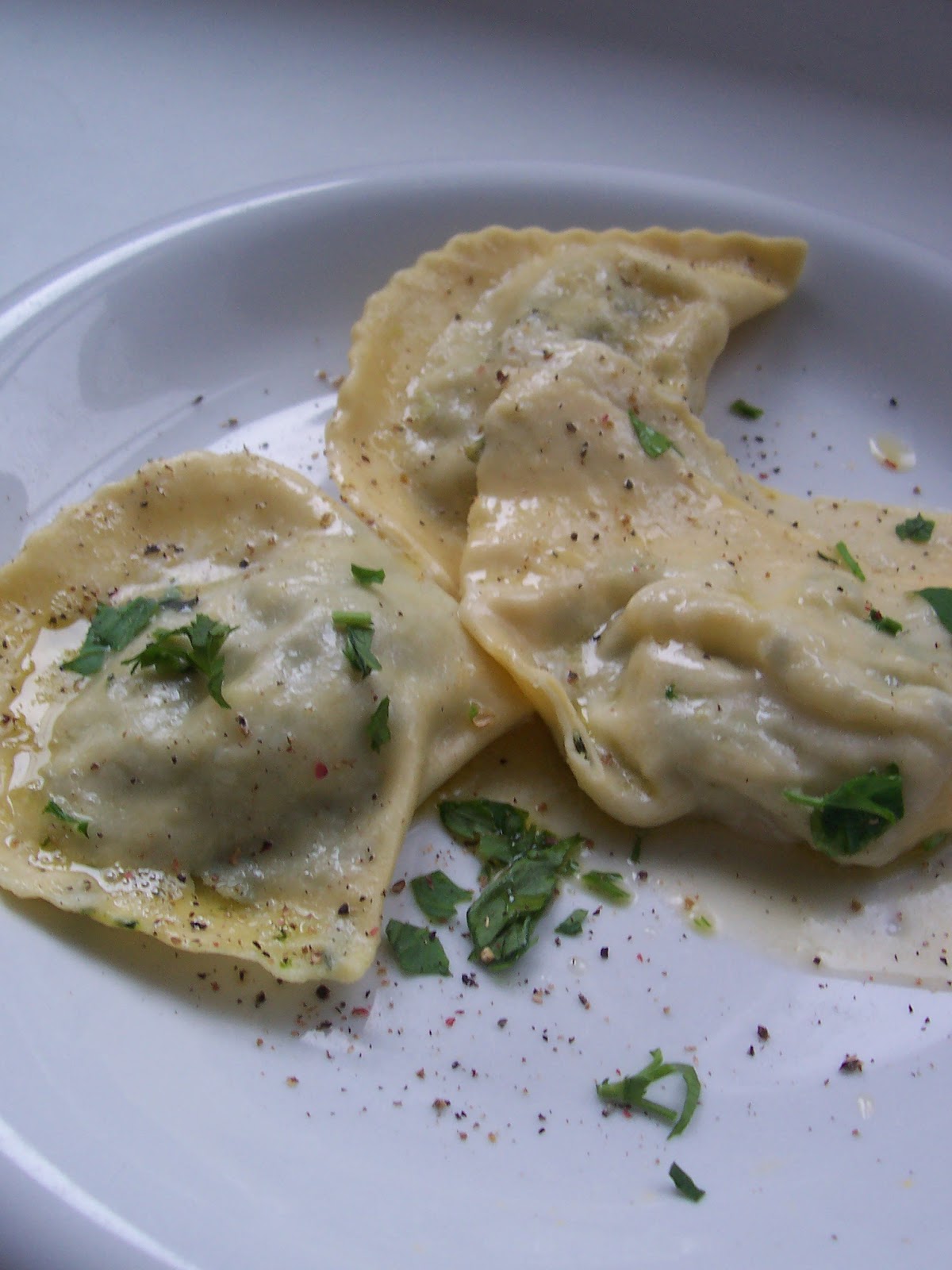 A ricottát összekeverem a megmosott és megtisztított apróra vágott spenóttal sózom, borsozom, pici szerecsendiót teszek hozzá. A tésztát kinyújtom, apró halmokat teszek a töltelékből, majd félbehajtom, a széleknél alaposan lenyomkodom, hogy bezárjam a kis táskákat. A tésztából a kép szerint derelyevágóval félholdakat vágok. 2 percig forrásban lévő vízben főzöm, majd vajas zsályás mártásba forgatom, reszelt parmezánnal meghintem és friss petrezselyemmel tálalom.