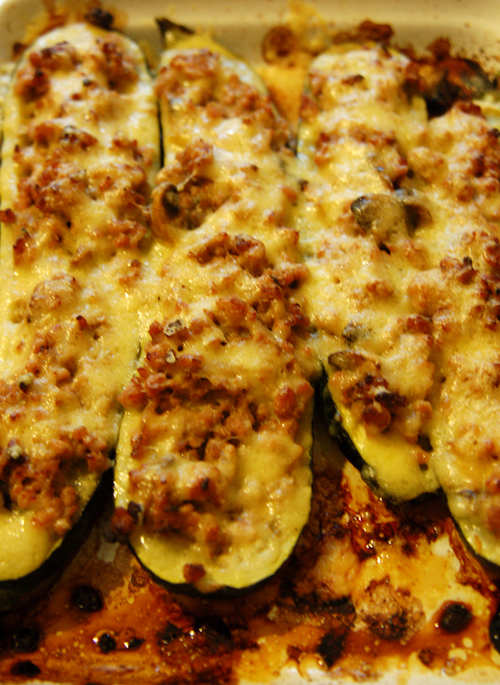 A cukkiniket félbevágom, egy kanál segítségével kivájom a belsejét, majd besózom és hagyom állni kb. fél órát. A cukkini ez idő alatt kiengedi a felesleges nedvességet. A hagymát apróra vágom, olajon megpirítom, hozzáadom a fokhagymát, majd a darált húst. Fűszerezem, és főzöm kb. 20-25 percig időnként megkevergetem. A paradicsomot felvágom apró kockákra, majd hozzáadom a húshoz, később a passzírozott paradicsomot is.