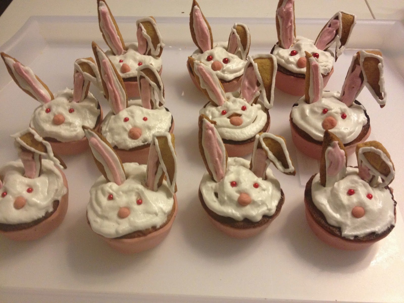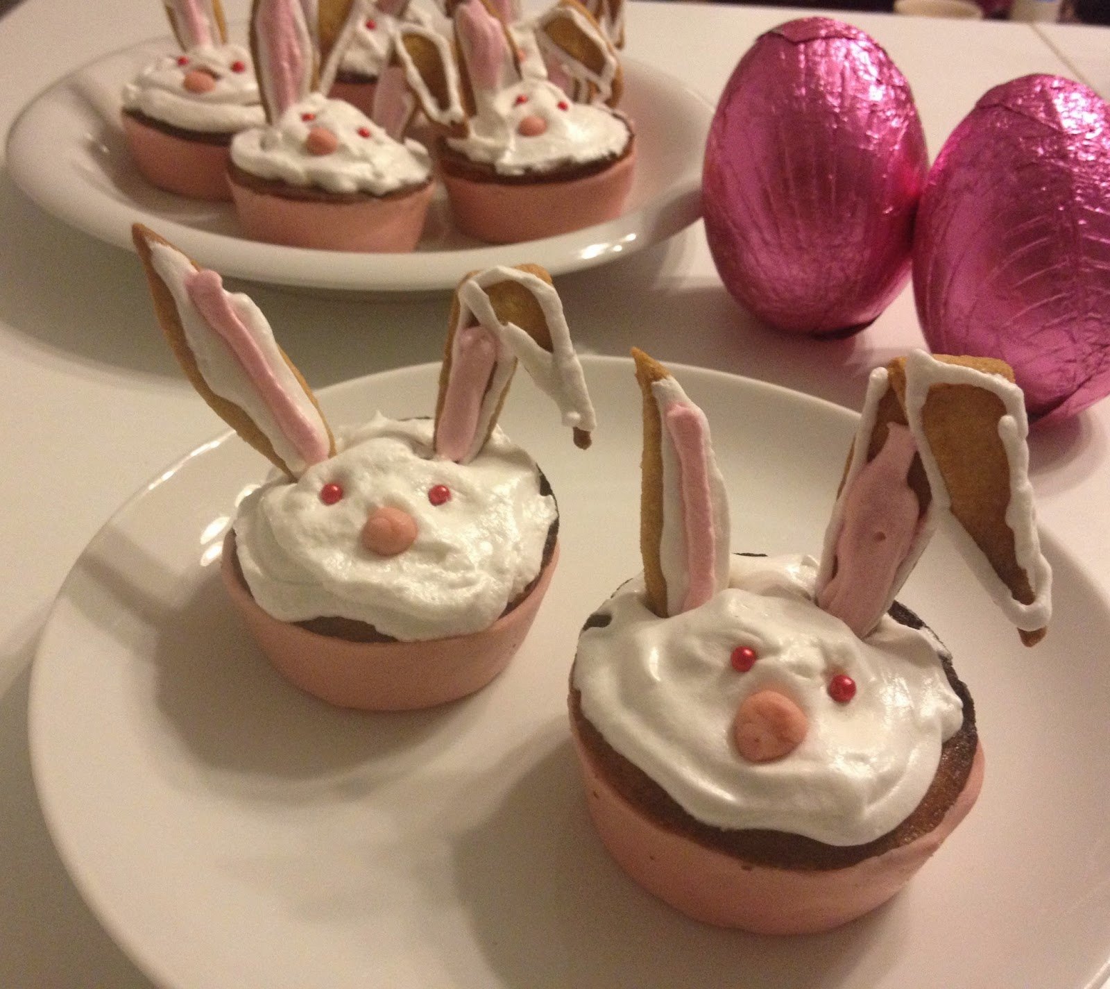 A tojásfehérjét 6 dkg porcukorral kemény habbá verem, majd nyomózsákba töltöm. A nyuszik fejéhez egy sima fejű véget használok, feldíszítem vele a 12 db sütit, majd beleszúrom a sütibe a füleket és azokat is feldíszítem.