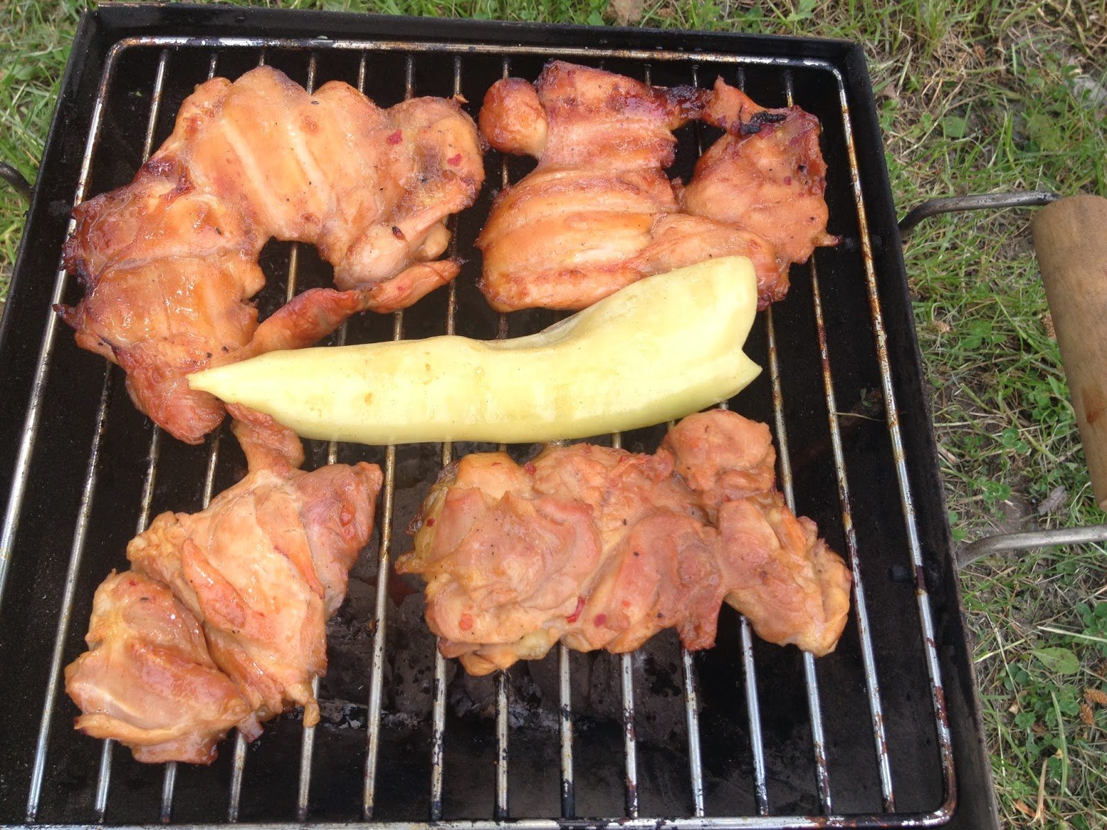 Most volt az első alkalom, hogy saját magam csináltam a grillezéshez az előkészületeket, a faszén összekészítés, tűzgyújtás, miegymás. Bevallom kissé aggódtam, mert nem volt annyira erős a meleg, majd később ti is meglátjátok, hogy ez így volt jó, mert szép lassan sült meg, hihetetlenül porhanyós lett a hús. Jöhet az otthon szépen bepácolt husi, amit ugye már előző nap este elkészítettem.