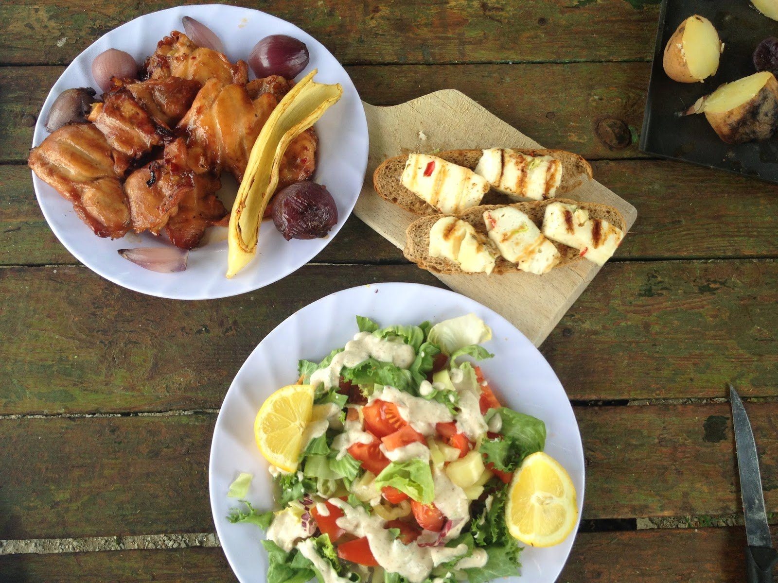 Köretek, saláták: maradék sajt, amit lehet grillezni, én juh gomolyát vittem, nagyon bejött. Paprika, paradicsom, lila hagyma, natúr joghurt, oregano, saláta, 1 citrom stb. Lehet mindent, ami van otthon.