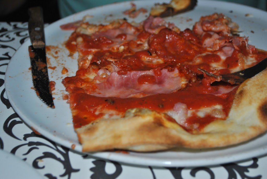 Férjem nem él a különlegességek kóstolásának a lehetőségével, biztosra megy. Ami pedig ezúttal a pomodoro alapú, használ vékony tésztán leheletnyi vékony prosciutto szeletek voltak. Figyelem itt jön a szakácsok bravúrja, ugyanis ezt a sonkát nem sütjük rá a pizzára, hanem a forró tésztára tesszük rá. Hurrá így volt ez itt is.