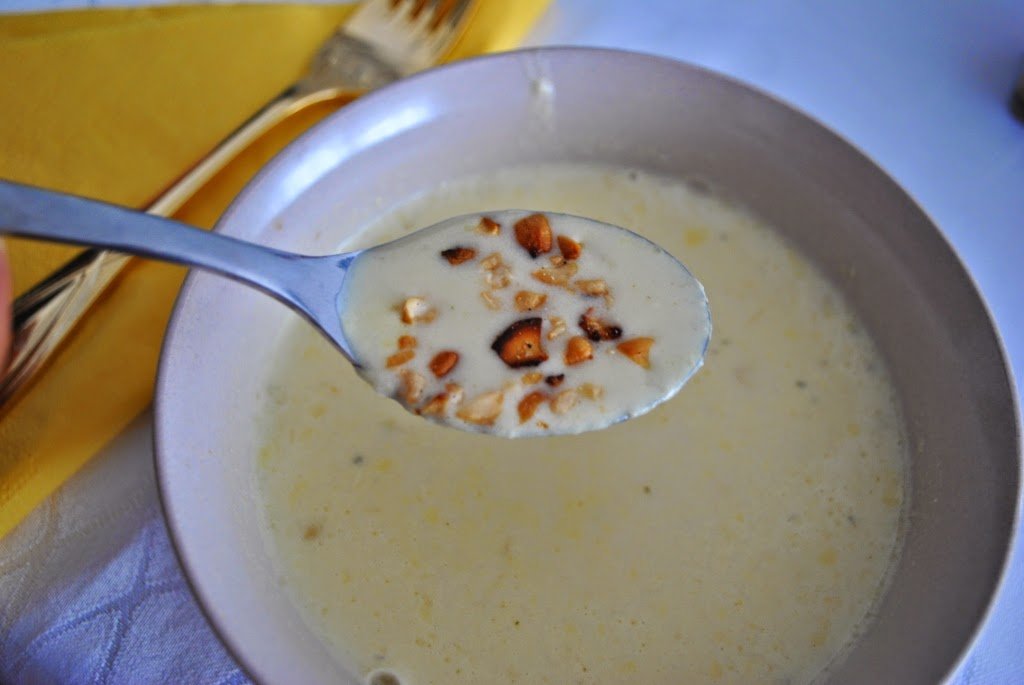 Pár percig pirítom, majd felöntöm a levessel, összeforralom, majd beleteszem a meghámozott és kockákra vágott burgonya. Addig főzöm, amíg meg nem puhul, ekkor hozzáöntöm a tejszínt és a juhtúrót is beleteszem, elkeverem, majd összepürésítem rúd mixerrel. Friss petrezselyemmel elkeverem, majd a durvára tört száraz serpenyőben pirított kesudióval megszórva tálalom.