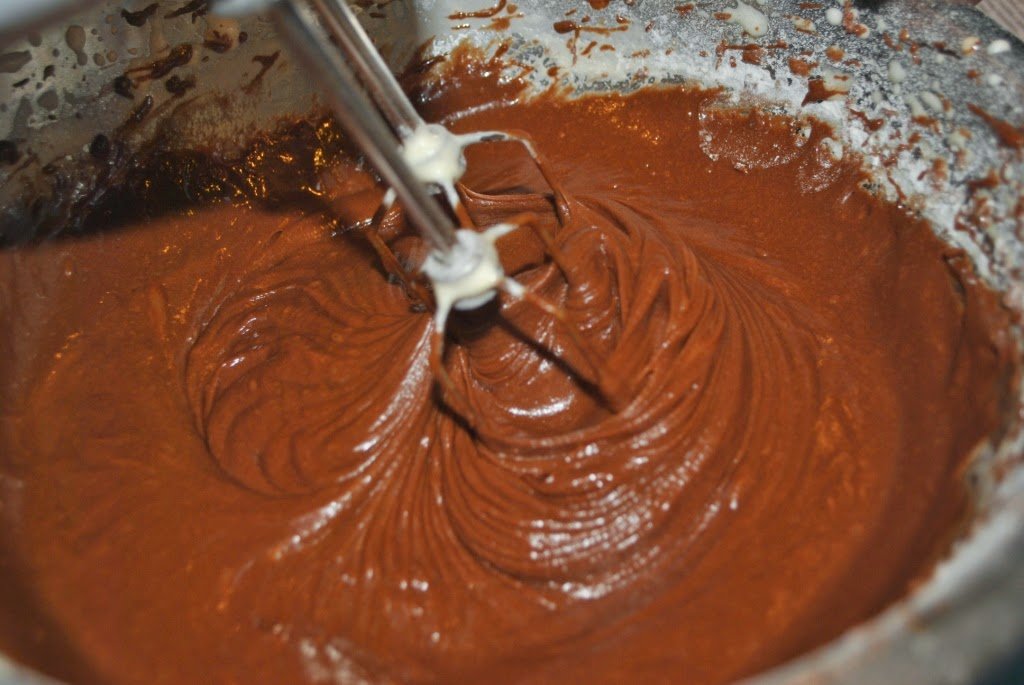 Először vízgőz felett megolvasztjuk a csokoládét és a puha vajat, félretesszük. A tojásokat a cukorral nagyon habosra keverjük, majd lassan folyamatos keverés közben hozzáöntjük a csokis keveréket, végül a lisztet is hozzákeverjük. Félretesszük, hiszen majd fogyasztás előtt fogjuk sütni.