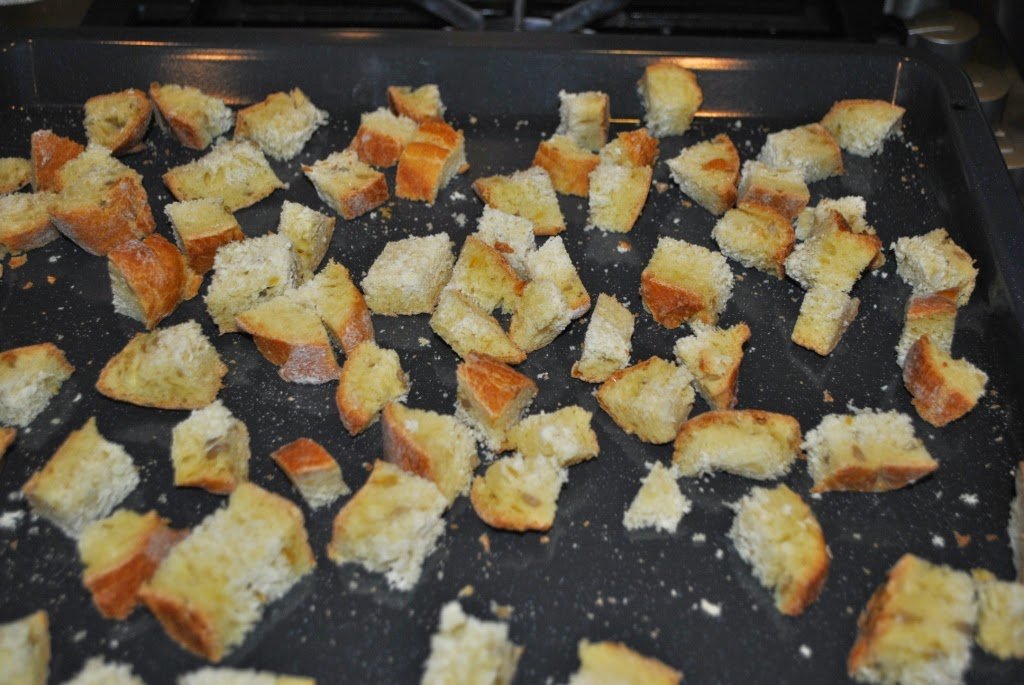 Három kaliforniai paprikát beteszünk 210 fokra előmelegített sütőbe 15 percre, majd egy fóliával lefedjük, hogy utána a héját lehúzhassuk. Ezt a trükköt érdemes megjegyezni, én gyakran alkalmazom. Egy bagettet kb 2 cm-es kockákra vágunk, 180 fokon 10 perc alatt ropogósra sütjük.