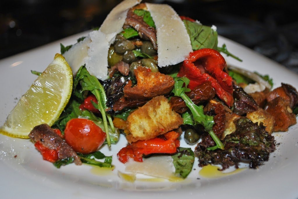Balzsamecetből, olivaolajból és citromléből salátaöntetet készítünk, sózzuk, borsozzuk és rálocsoljuk a kenyérre, majd válogatunk bele mindenféle mediterrán finomságot. Mindenki kedve szerint állítja össze a saját salátáját. Én nem sajnáltam magamtól semmit, ment bele koktélparadicsom, aszalt paradicsom kockák, olajbogyó karikák (én mindig a feketét választom), kapribogyó, ruccola, római saláta, vagy amilyen salátát szerettek, néhány darab szardella filé, bazsalikom ezeket ha szükséges összetépkedjük, majd összerázzuk a kenyérkockákkal együtt, végül parmezánforgácsokkal díszítjük. Húúúú! Hát ez várakozásaimon felül szuper fincsi lett.