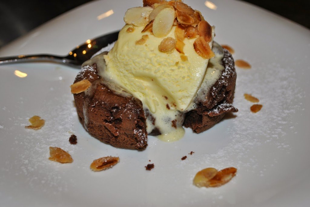 A desszerttel a csupa csokis finomsággal kezdtük, egy olyan tökéletes szuflészerűség, aminek természetesen az olvasztott lávacsoki ott bugyogott a belsejében.