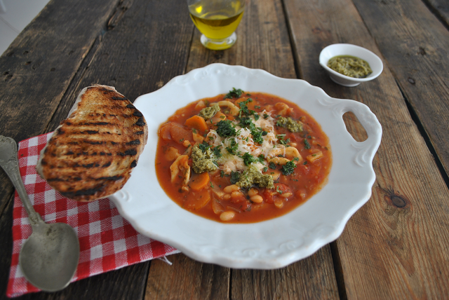 Hozzávalók: 3 normál sárgarépa, 1 szál gyökér, 1 kicsi zellergumó a zöldjével, 400 g hámozott paradicsom (lehet konzerv), 400 g paradicsompüré, 1 l zöldség alaplé, só, frissen őrölt bors, bazsalikom, oregano, olívaolaj, kb 4 szelet füstölt bacon, 250 g éjszakára beáztatott bab (fehér, vagy vörös is lehet), kb 4 gerezd fokhagyma, 1 nagy fej lila hagyma, 10 dkg parmezán sajt reszelve, 1 csokor friss petrezselyem, ízlés szerint zöld pesto,