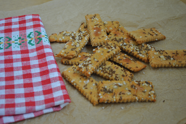 A sütőt közben 180 fokra előmelegítem. A tésztát lisztezett deszkán kinyújtom, a tetejét tojással megkenem, majd egész köménnyel és a sóval megszórom, ráfektetek egy papírt és óvatosan kicsit a tésztába nyomkodom, majd téglalap alakú lapocskákra vágom (én derelye vágót használtam, hogy cakkos legyen a széle), majd egy hústűvel, vagy hasonló eszközzel megszurkálom a tésztát, ez azért kell, mert sütés közben meg fog emelkedni. Sütőpapírral bélelt tepsibe rakom, kis kihagyásokkal, majd 10-15 perc alatt készre sütöm.