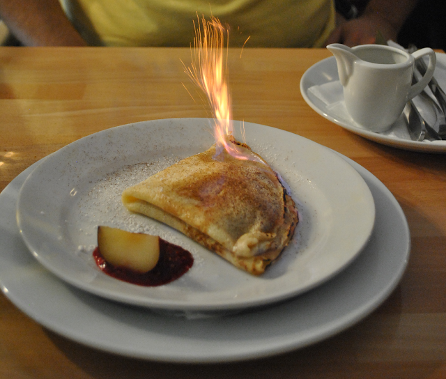Desszertet most akár ki is hagyhattuk volna tekintve, hogy pukkadásig ettük már magunkat, de a flambírozott szilvalekváros palacsinta iránti kíváncsiság azért ott motoszkált a gondolataimban. Látványelemként kapja az ember az ilyet, persze a többi vendég is nézi, mi történik itt. Extra ötlet, hogy a pálinka égése közben fahéjat szórnak rá, ami így szikrázik. Azért már ezért a kis mókáért is megérte. Brutálisan finom volt, azért ketten megbirkóztunk vele, imádtuk!