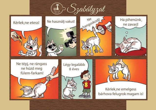 Most Veszprémben voltunk egy ilyen cicás helyen, a Kultúrmacska Kávézóban. Itt a vendégeknek való kedveskedés mellett a cicákra is odafigyelnek, egy kedves leírás tájékoztat az érvényes játékszabályokról:
