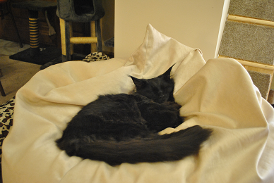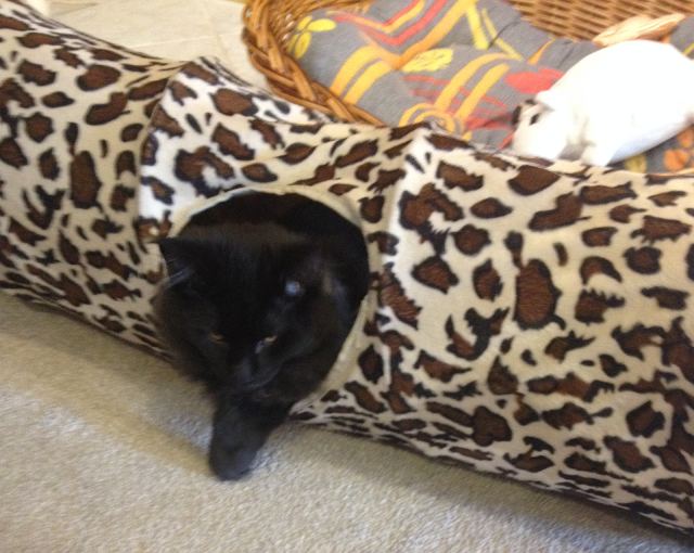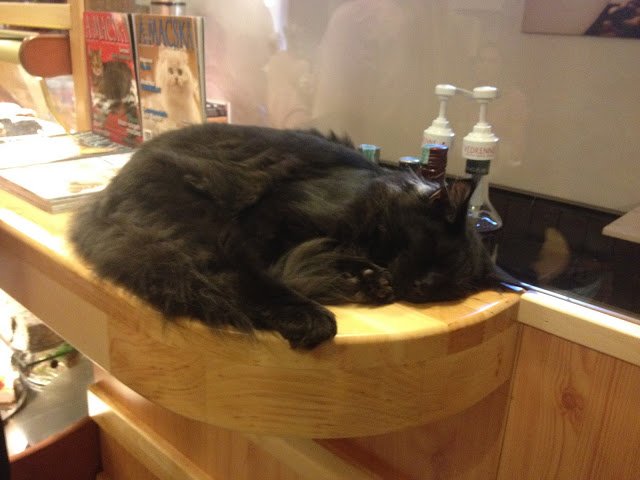 Kávészürcsölés közben körbenéztünk a cicusoknál. Bejáratnál egy óriás babzsákfotelben heverészik VOLDEMORT, a fekete Maine Coon, az ügyeletes királyfi. Miután tudja, hogy minden rendben van, nem különösebben izgatja a körülötte zajló világ, tőle akár bomba is robbanhatna, Ő max fordul egyet. Később a lazulást egy óriás leopárd mintás bújós hengerben, majd a pult szélén folytatja, hogy még többen simizzék.