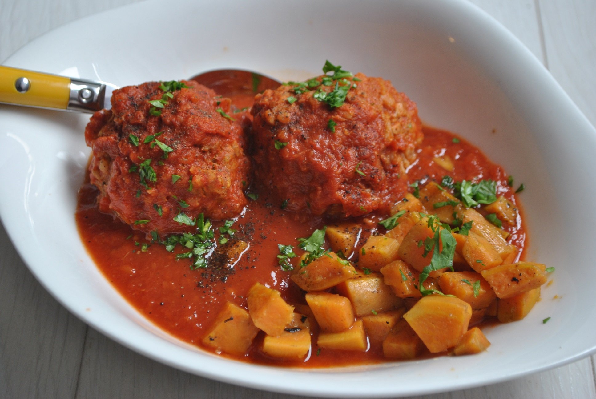 Korábban már írtam róla, hogy nálunk a töltött paprika nem is töltött, mert mi csak a töltést esszük, vagyis, amit az ember beletöltene a paprikába, azt mi gombócoljuk és kifőzzük. Nem szeretjük a nagy darab főtt paprikát. Mindezt jó sok paradicsommártással öntjük nyakon, amiben viszont már megjelenik a paprika, mert lecsó alapú a történet. Ezt az igazán kedvelt családi ételt én most még továbbalakítottam, okos szénhidrátokat használtam hozzá. A rizst bulgurra váltottam ki, a mellé kínált burgonyát pedig édesburgonyára cseréltem. Egyébként nem is szoktunk mindig burgonyát enni mellé, általában csak a gombócot, meg a paradicsommártást, ezért ez a recept most ebben is egyedülálló.