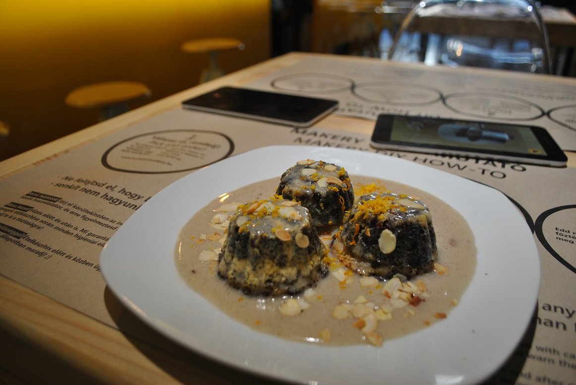 Desszertnek pedig mákos gubát választottunk, persze ez sem a hagyományos módon készült, hanem szilikon sütőformába sütöttük össze a tésztakorongokat a mandulatejes sodóval. Nekem, mazsolagyűlölőnek a legjobb hír, hogy a mazsolát aszalt áfonyára cserélték az alapanyagok között. Dekorációnak pirított illatos mandulapelyhet és narancshéjat szórtunk a tetejére.