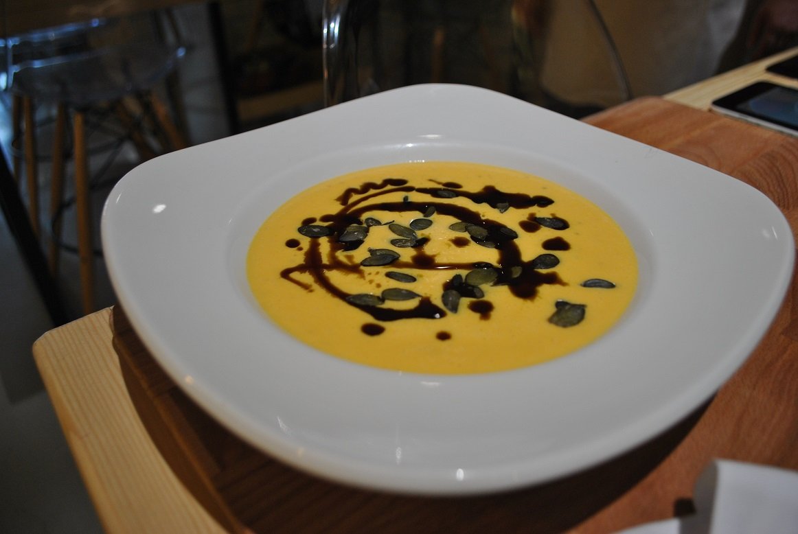 Sütőtök krémleves tökmagolajjal és tökmaggal – valami brutál, és megfejtettem a vajtól lett ennyire krémes, ezután itthon is mindig teszek egy kanálnyi vajat, hogy még krémesebb és teltebb íze legyen.