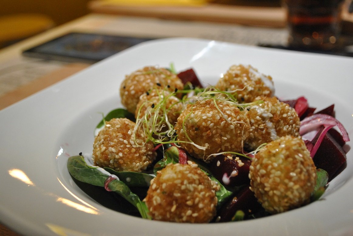 Zöldfűszeres juhtúrógolyó narancsos céklasalátával – Imádtam, igaz miután minden elkészült, feltűnt, hogy nekem megmaradt a vaj. Ja, igen abban kellett volna a morzsát megpirítani, de nem baj, akkor gyorsan beledobtam a serpenyőbe, átpirítottam a golyókat, szuper lett. Lehet, hogy ennek a kis benézésemnek köszönhetően módosítják az eredeti receptet is, mert így ropogósabb lesz a panír. Na erre a fogásra Tibi annyit mondott, hogy finom előétel volt. Nem akartam összetörni a lelkét, hogy ez egy főétel, csak éppen húsmentes. A túrógombócok elég laktatóak tudnak lenni.