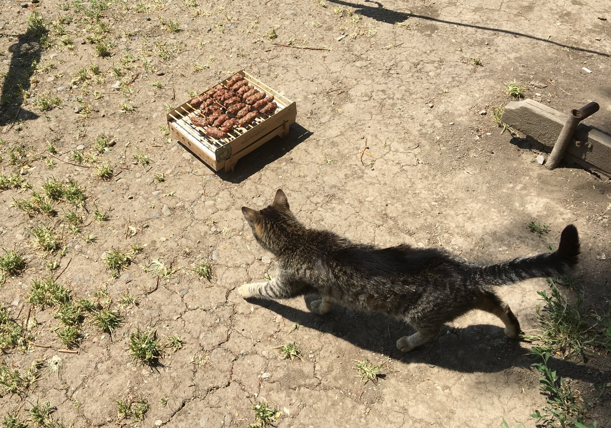 Ahogy a képen is látszik érkezett egy vendégünk is ebédre, nem volt szégyenlős, a kínálgatásra elfogadta a falatkákat, aztán amikor egy pillanatra nem figyeltünk a következő jelenet volt megfigyelhető: a macsek a szájában egy grillkolbásszal rohan, mögötte a kutya, bízva abban, majdcsak jut neki is valami.