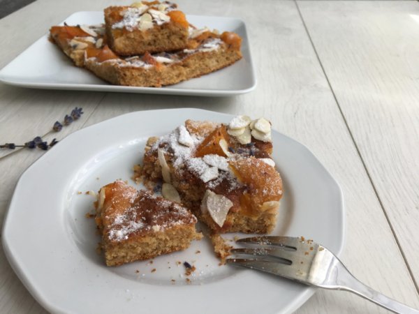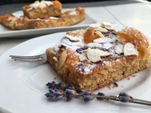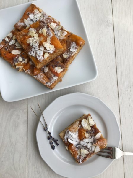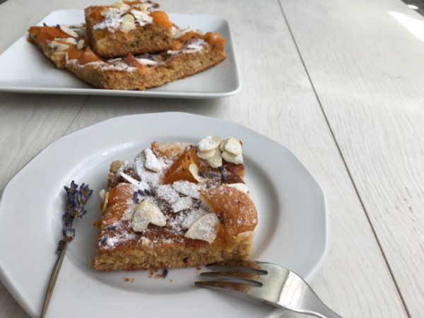 A masszát sütőpapírral kibélelt tepsibe öntöm, majd a felezett, magozott barackot a tésztán elrendezem. Néhány szem levendula virágot is szórok rá.A barackok majd kicsit belesüllyednek a tésztába, sütés közben pedig a tésztával együtt megemelkednek. 160 fokra előmelegített sütőben 25-30 perc alatt megsütöm. Tűpróbával ellenőrzöm, hogy a tészta belseje is megsült e.