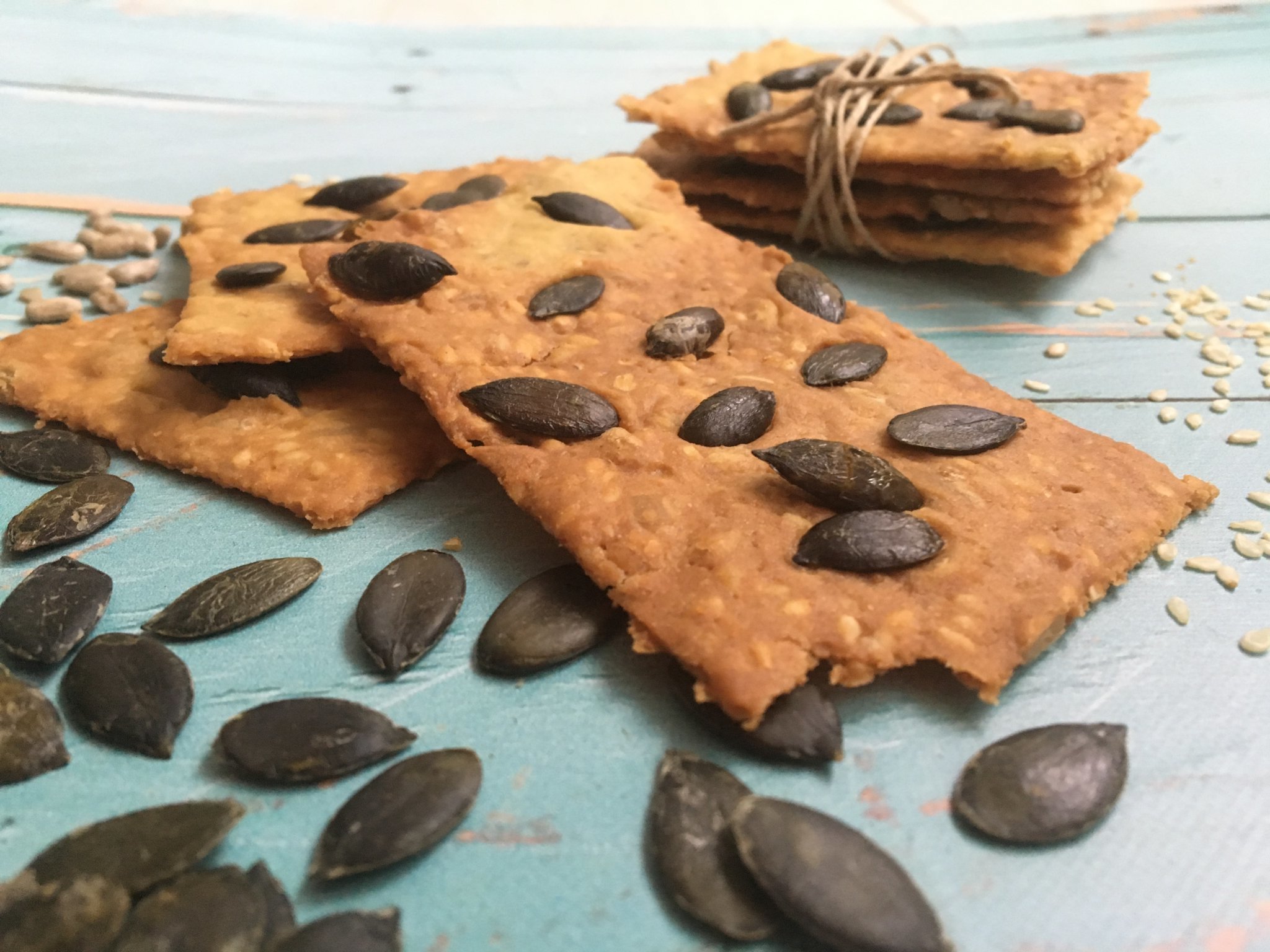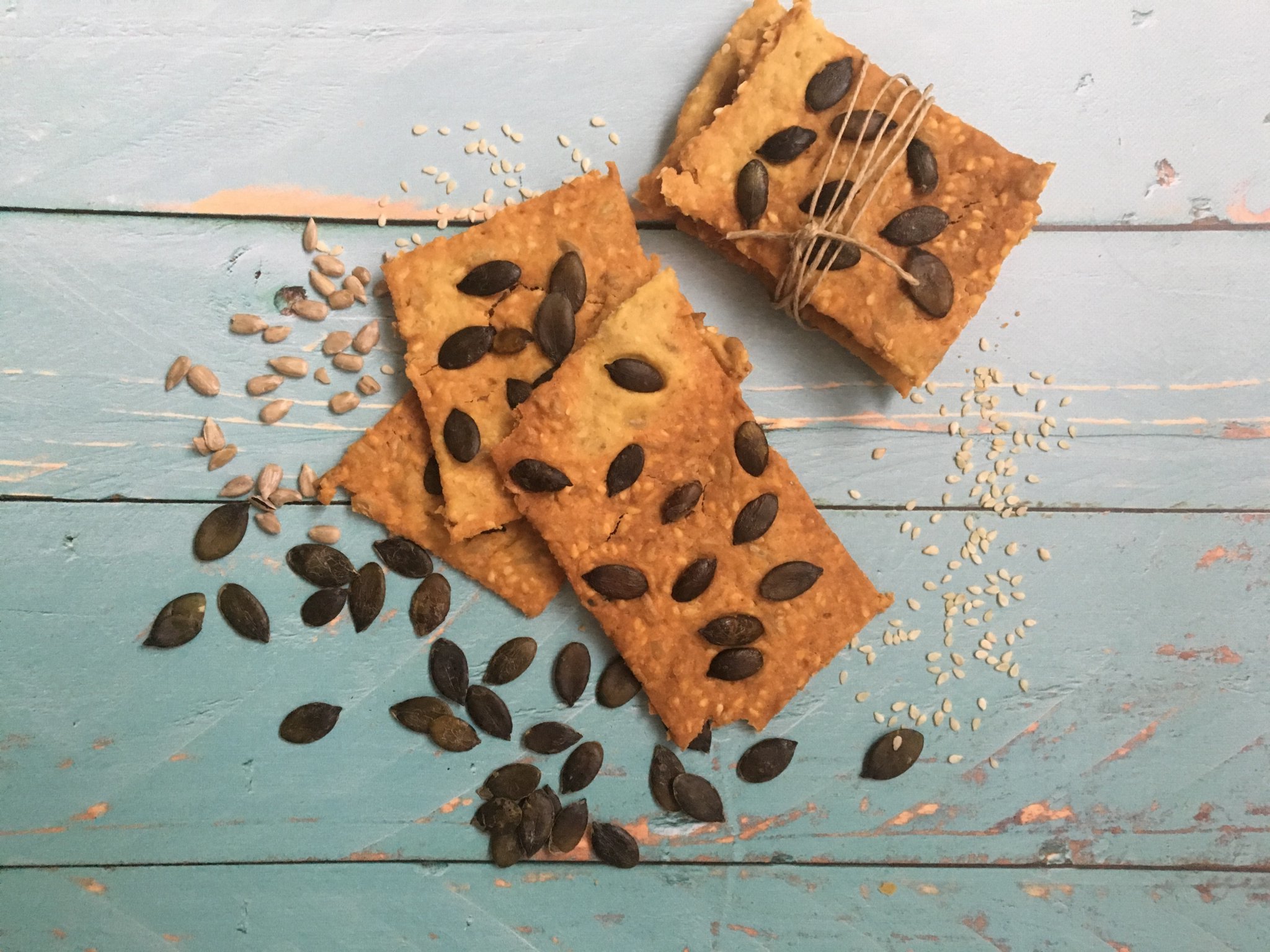 Összekeverem a liszteket, valamint a szezámmagot és a napraforgómagot, mehet hozzá a só, az olaj és a víz is. A masszát kiterítem egy sütőpapírral bélelt nagy tepsibe (nekem ilyen méretű a tepsim cm x cm), majd még egy réteg sütőpapírt teszek rá és kézzel elegyengetem, hogy a tészta egyenletesen elterüljön. Egy pizzavágóval téglalap alakúra felvágom, majd megszórom a tökmaggal, kicsit a tökmagot belenyomkodom a tésztába, hogy sütés után ne potyogjon le. A tésztát azért sütés előtt vágom fel, mert így szabályos szeleteket lehet kapni. Amennyiben sütés után darabolod, akkor inkább törni lehet. A tökmagot pedig azért nem kevertem bele a tésztába, mivel ezeknek a magoknak nagyobb a méretük, szintén akadályoznák a szabályos szeletek készítését.