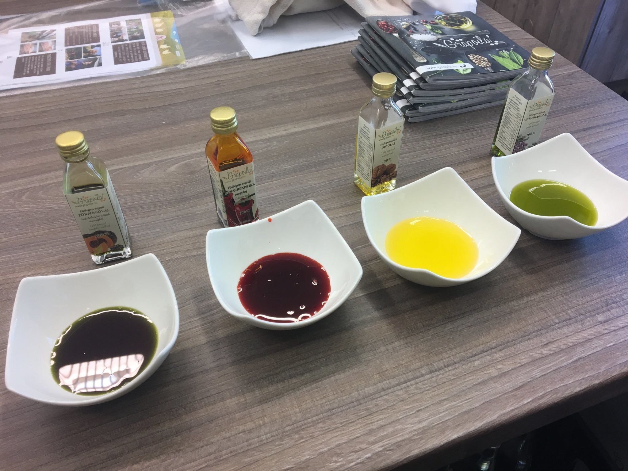 És mindezek után levezetésként a Grapoila cég különleges olajaiba mártogattuk a kenyérkockáinkat. Dió- és tökmagolajat kóstoltam már, nagyon finomak. Viszont most kóstoltam először szőlőmagolajat, valamint a szinte hihetetlen paprika-magolajat is.